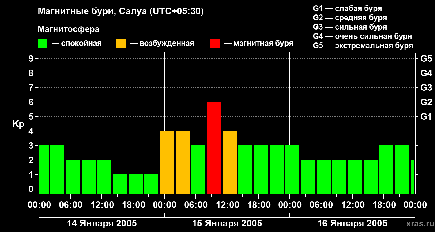 Изменения геомагнитного индекса Kp с 14 по 16 января 2005 года для средних широт