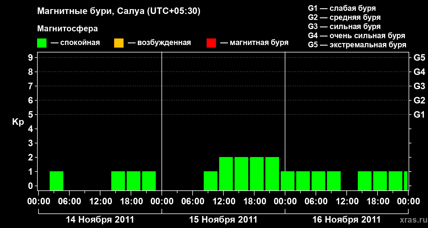 Изменения геомагнитного индекса Kp с 14 по 16 ноября 2011 года для средних широт