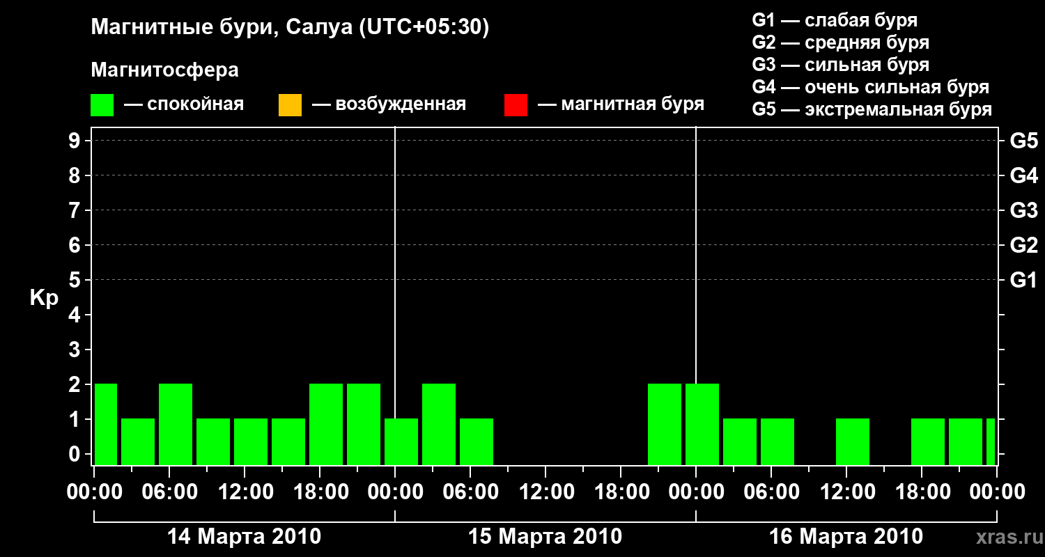 Изменения геомагнитного индекса Kp с 14 по 16 марта 2010 года для средних широт