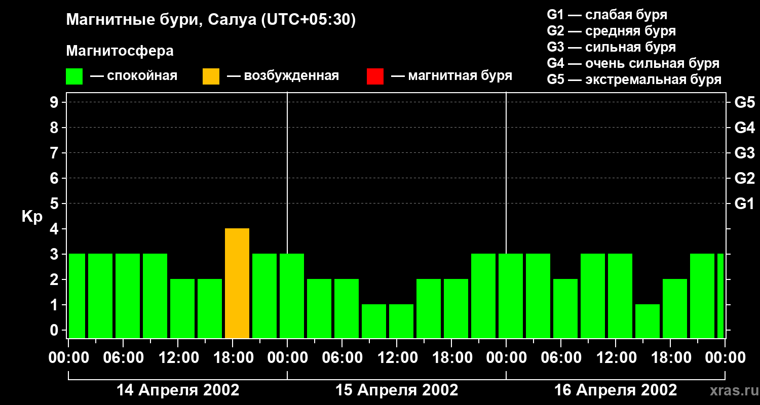 Изменения геомагнитного индекса Kp с 14 по 16 апреля 2002 года для средних широт
