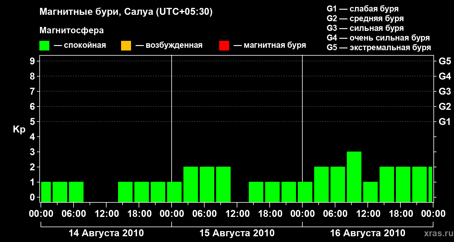 Изменения геомагнитного индекса Kp с 14 по 16 августа 2010 года для средних широт