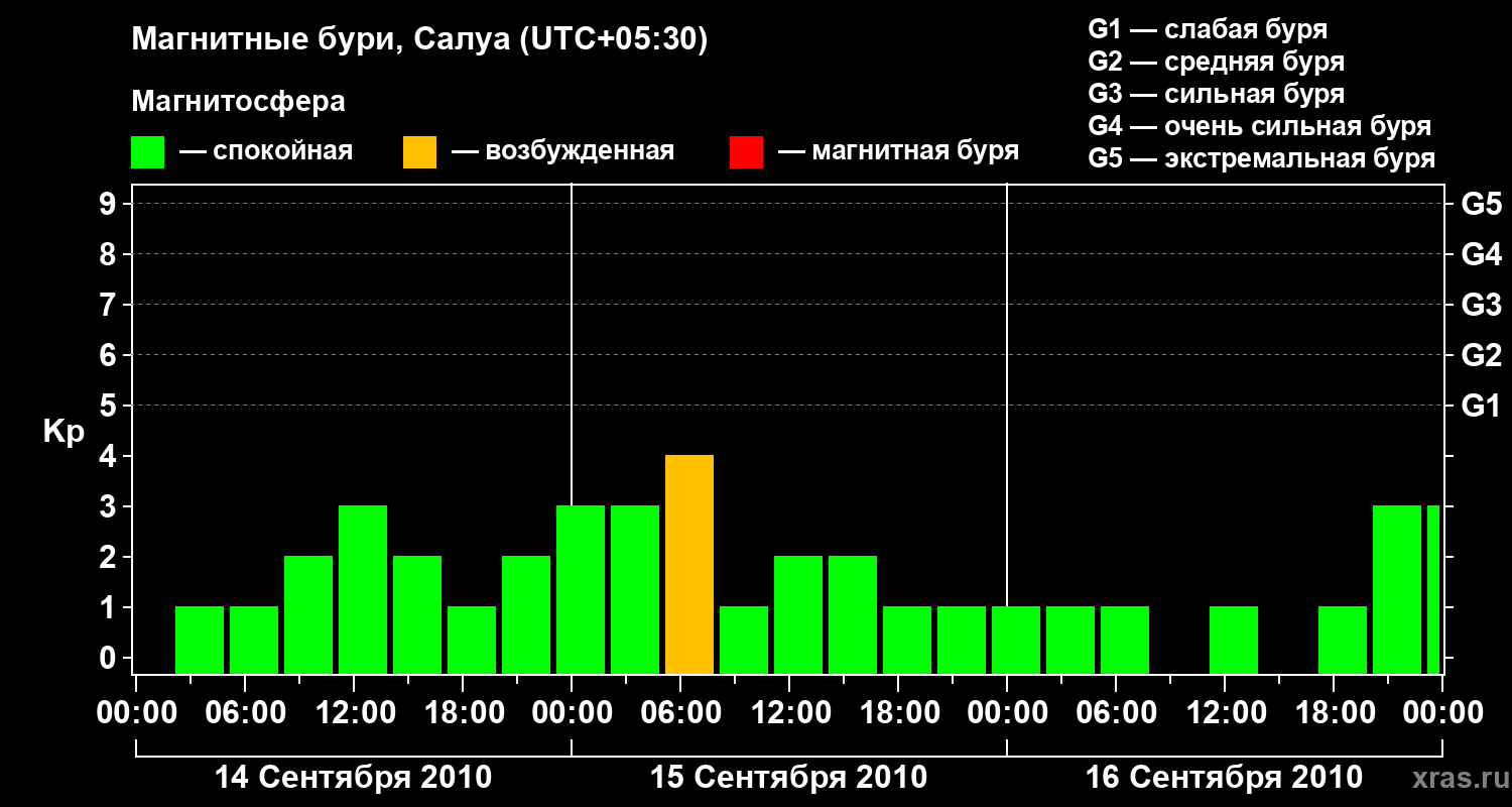 Изменения геомагнитного индекса Kp с 14 по 16 сентября 2010 года для средних широт