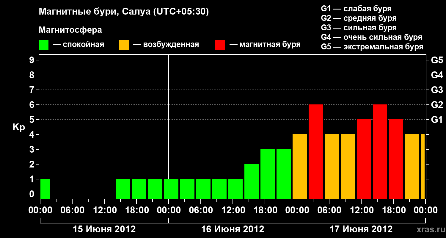 Изменения геомагнитного индекса Kp с 15 по 17 июня 2012 года для средних широт