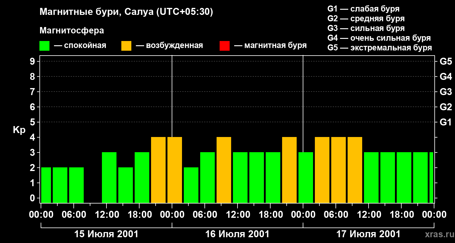 Изменения геомагнитного индекса Kp с 15 по 17 июля 2001 года для средних широт