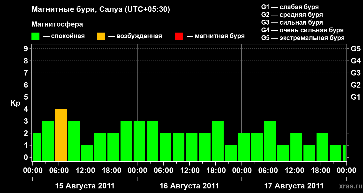 Изменения геомагнитного индекса Kp с 15 по 17 августа 2011 года для средних широт