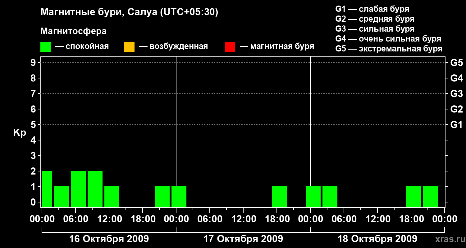 Изменения геомагнитного индекса Kp с 16 по 18 октября 2009 года для средних широт