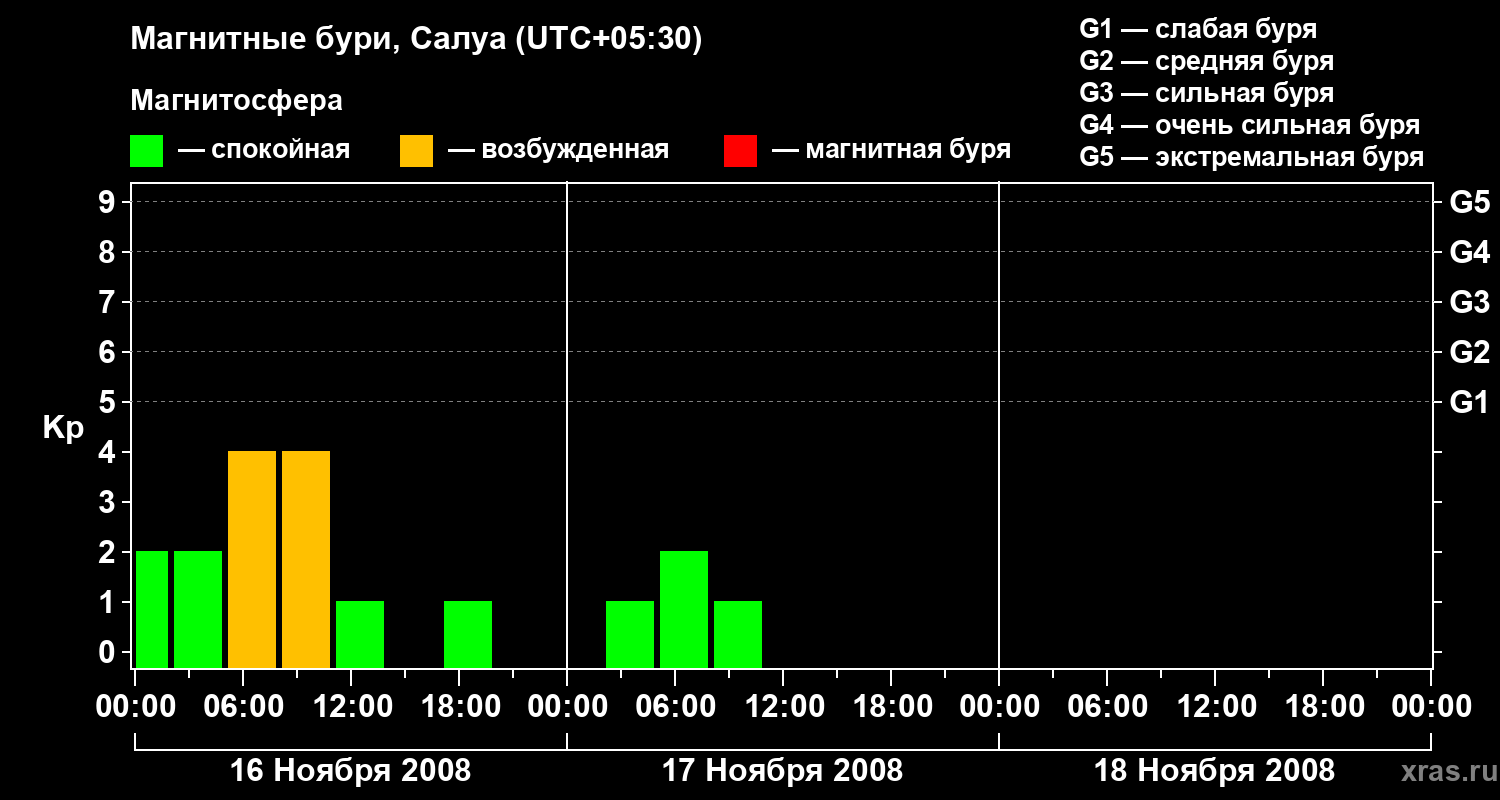Изменения геомагнитного индекса Kp с 16 по 18 ноября 2008 года для средних широт