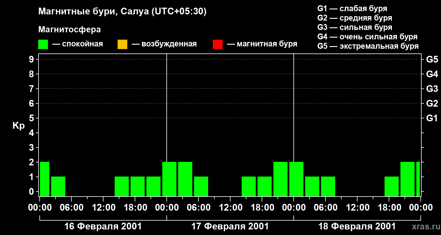 Изменения геомагнитного индекса Kp с 16 по 18 февраля 2001 года для средних широт