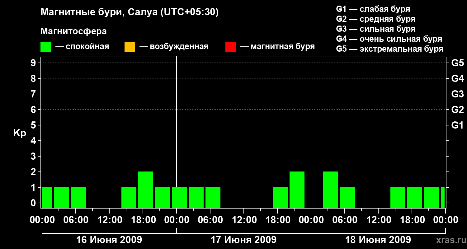 Изменения геомагнитного индекса Kp с 16 по 18 июня 2009 года для средних широт