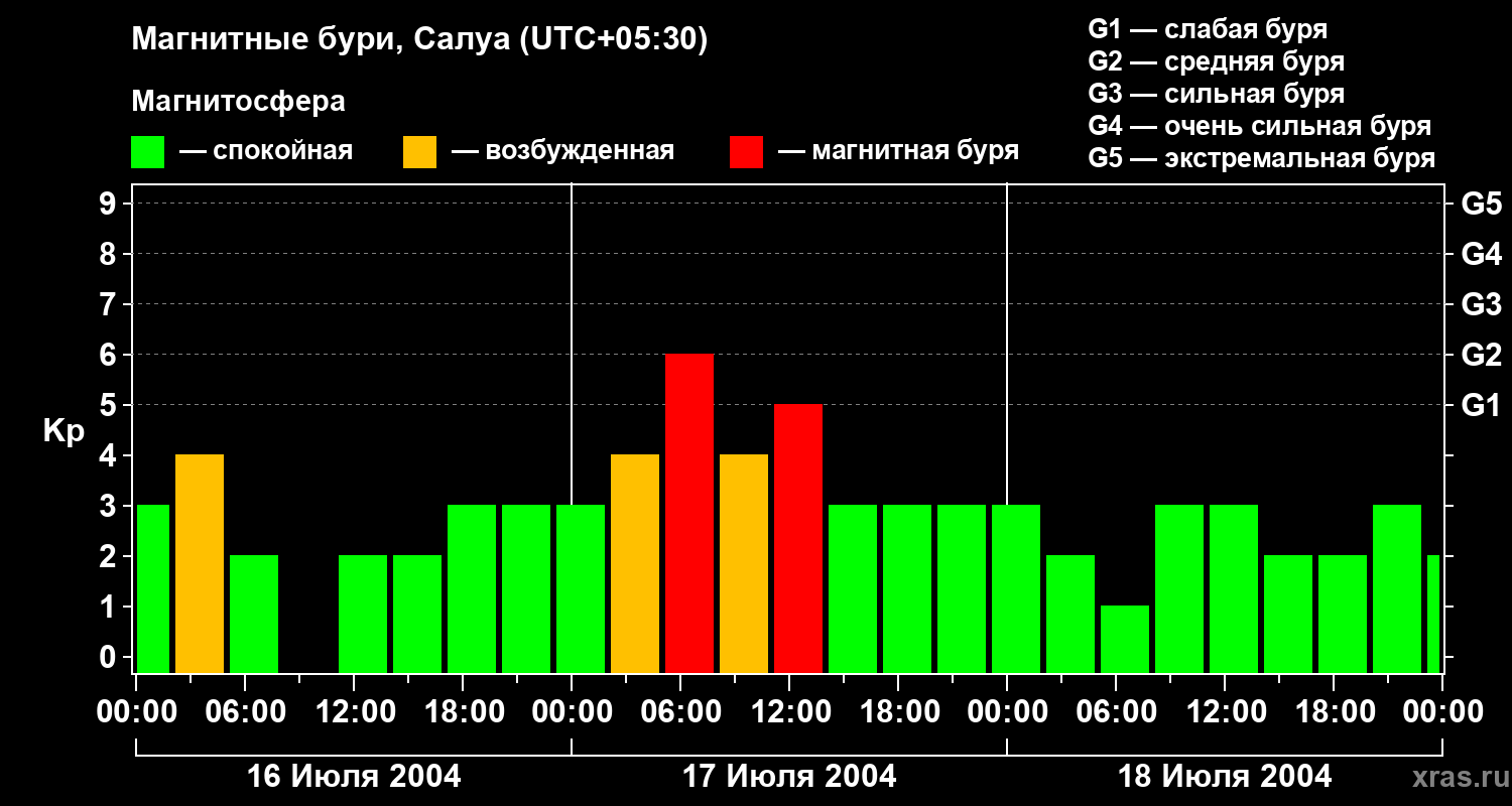Изменения геомагнитного индекса Kp с 16 по 18 июля 2004 года для средних широт