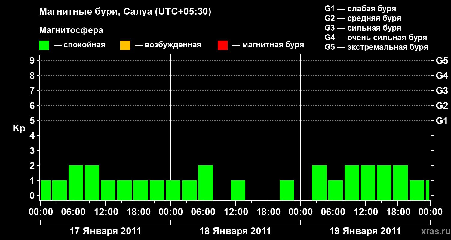 Изменения геомагнитного индекса Kp с 17 по 19 января 2011 года для средних широт