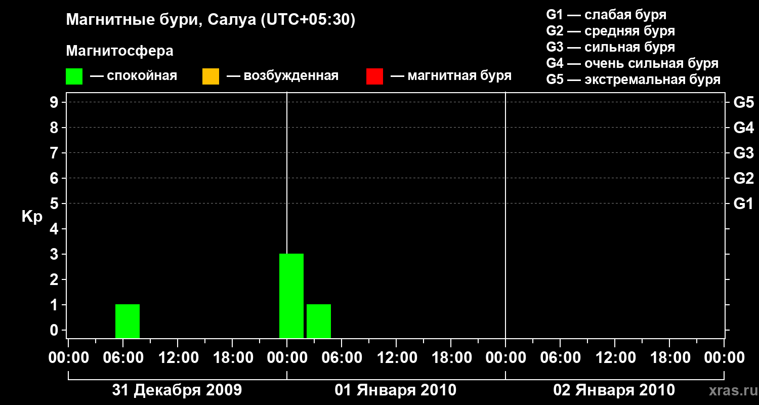 Изменения геомагнитного индекса Kp с 31 декабря 2009 года по 2 января 2010 года для средних широт