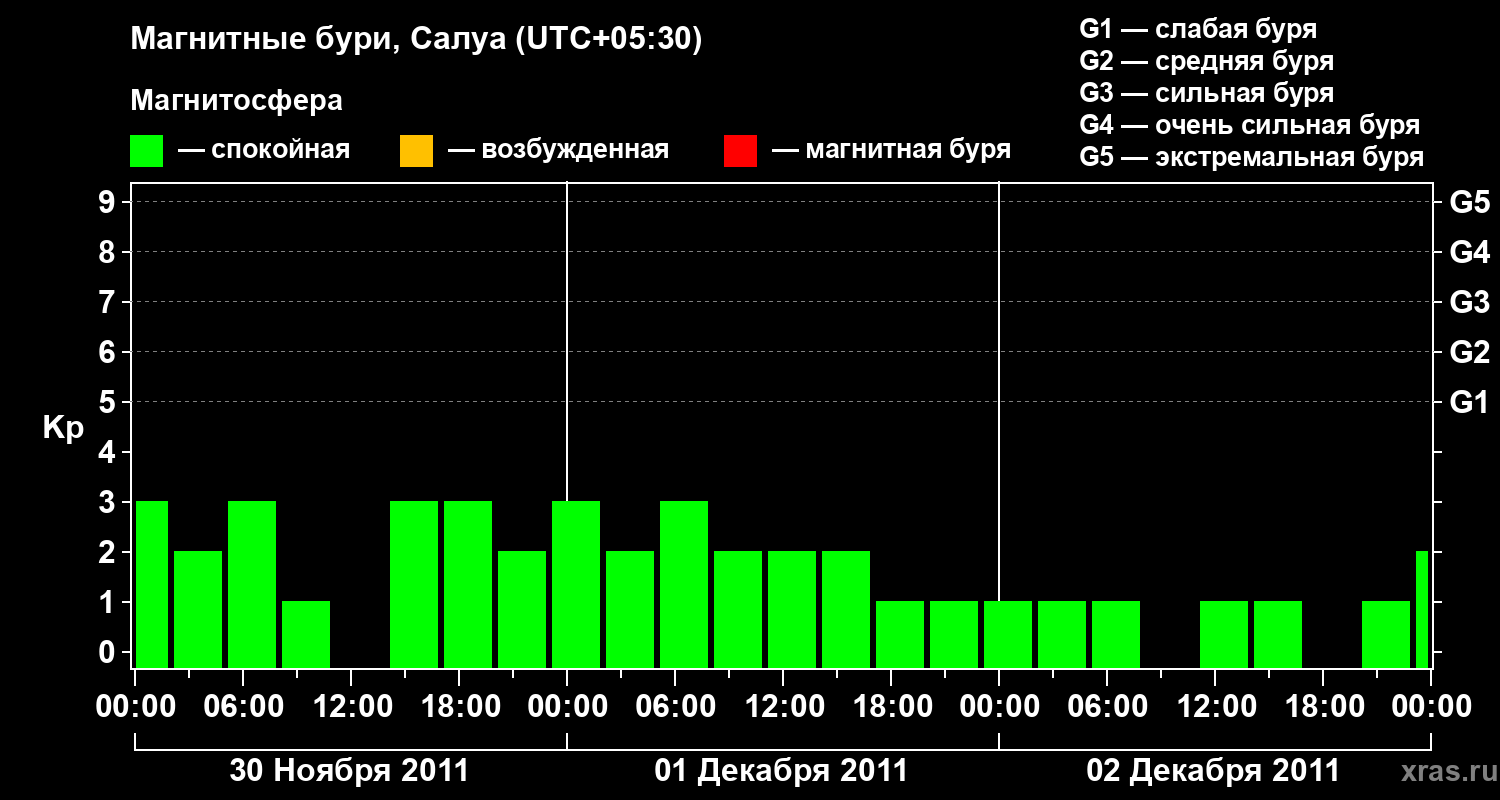 Изменения геомагнитного индекса Kp с 30 ноября по 2 декабря 2011 года для средних широт