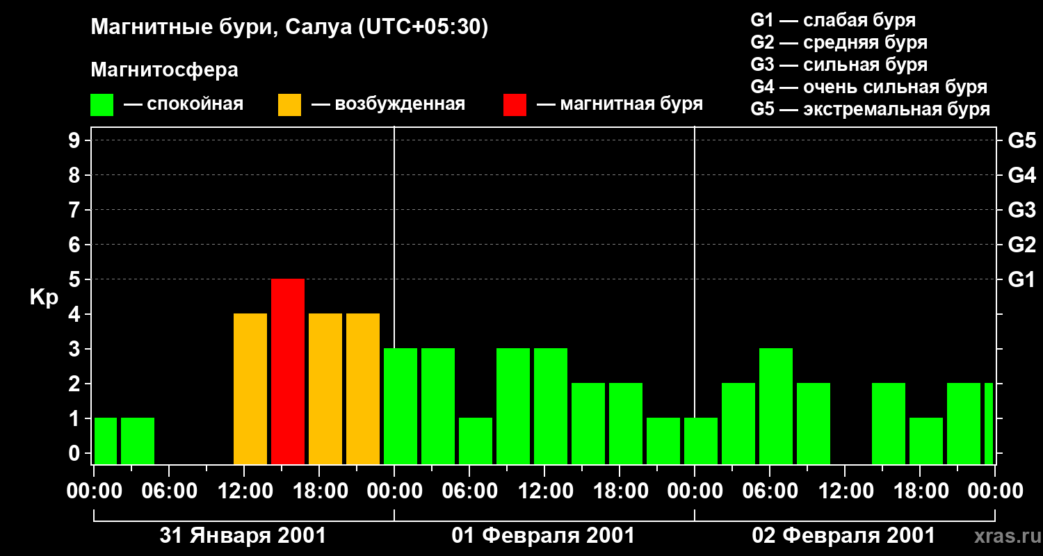 Изменения геомагнитного индекса Kp с 31 января по 2 февраля 2001 года для средних широт