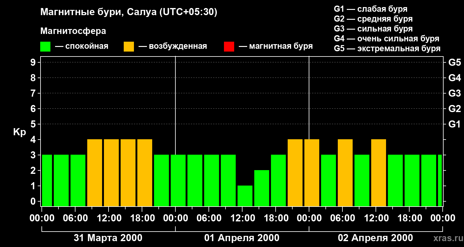 Изменения геомагнитного индекса Kp с 31 марта по 2 апреля 2000 года для средних широт
