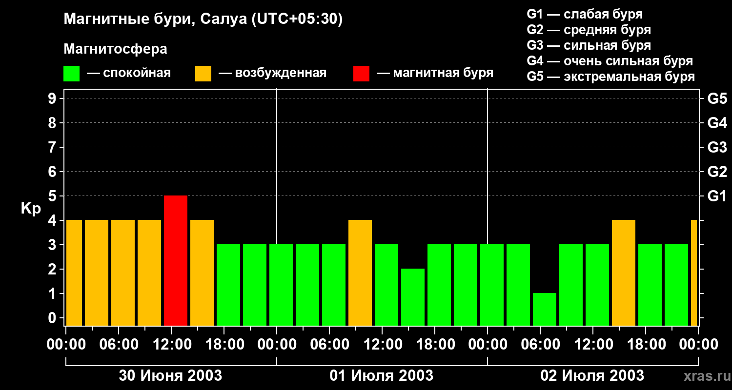 Изменения геомагнитного индекса Kp с 30 июня по 2 июля 2003 года для средних широт