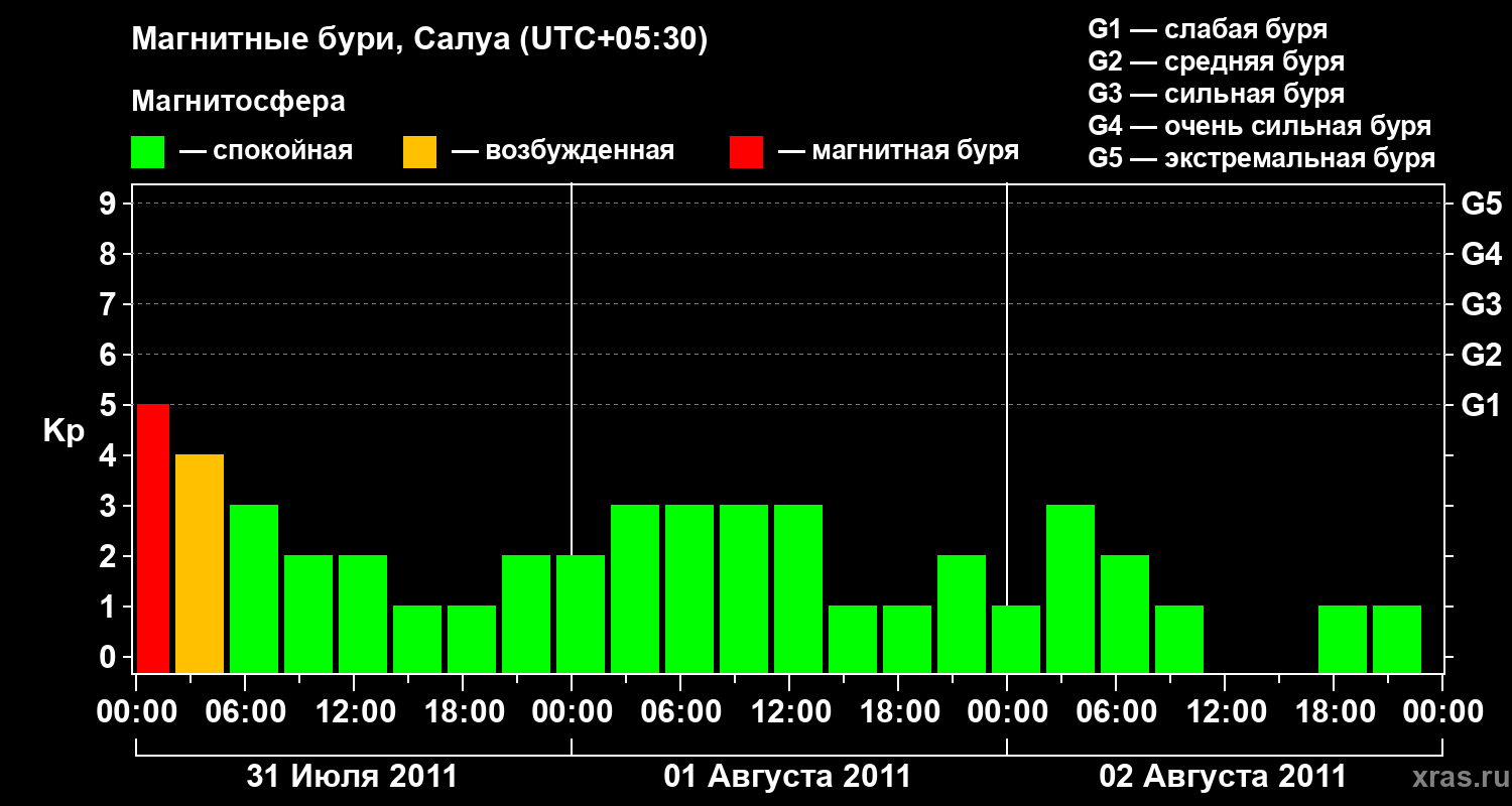 Изменения геомагнитного индекса Kp с 31 июля по 2 августа 2011 года для средних широт