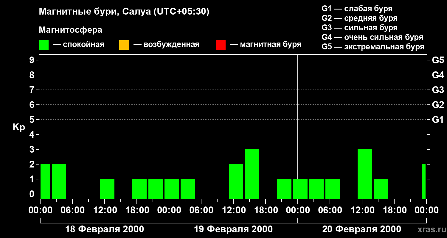 Изменения геомагнитного индекса Kp с 18 по 20 февраля 2000 года для средних широт