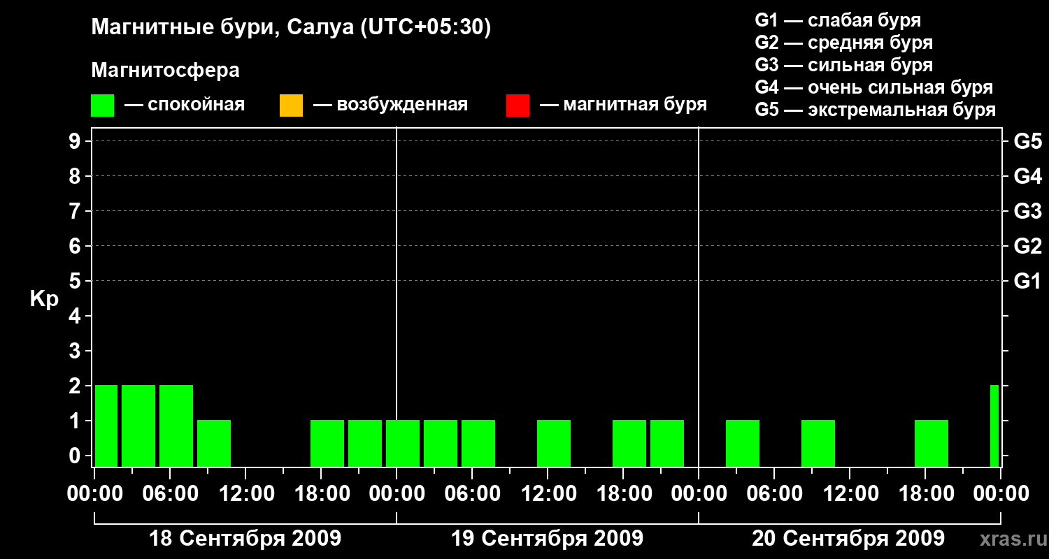 Изменения геомагнитного индекса Kp с 18 по 20 сентября 2009 года для средних широт