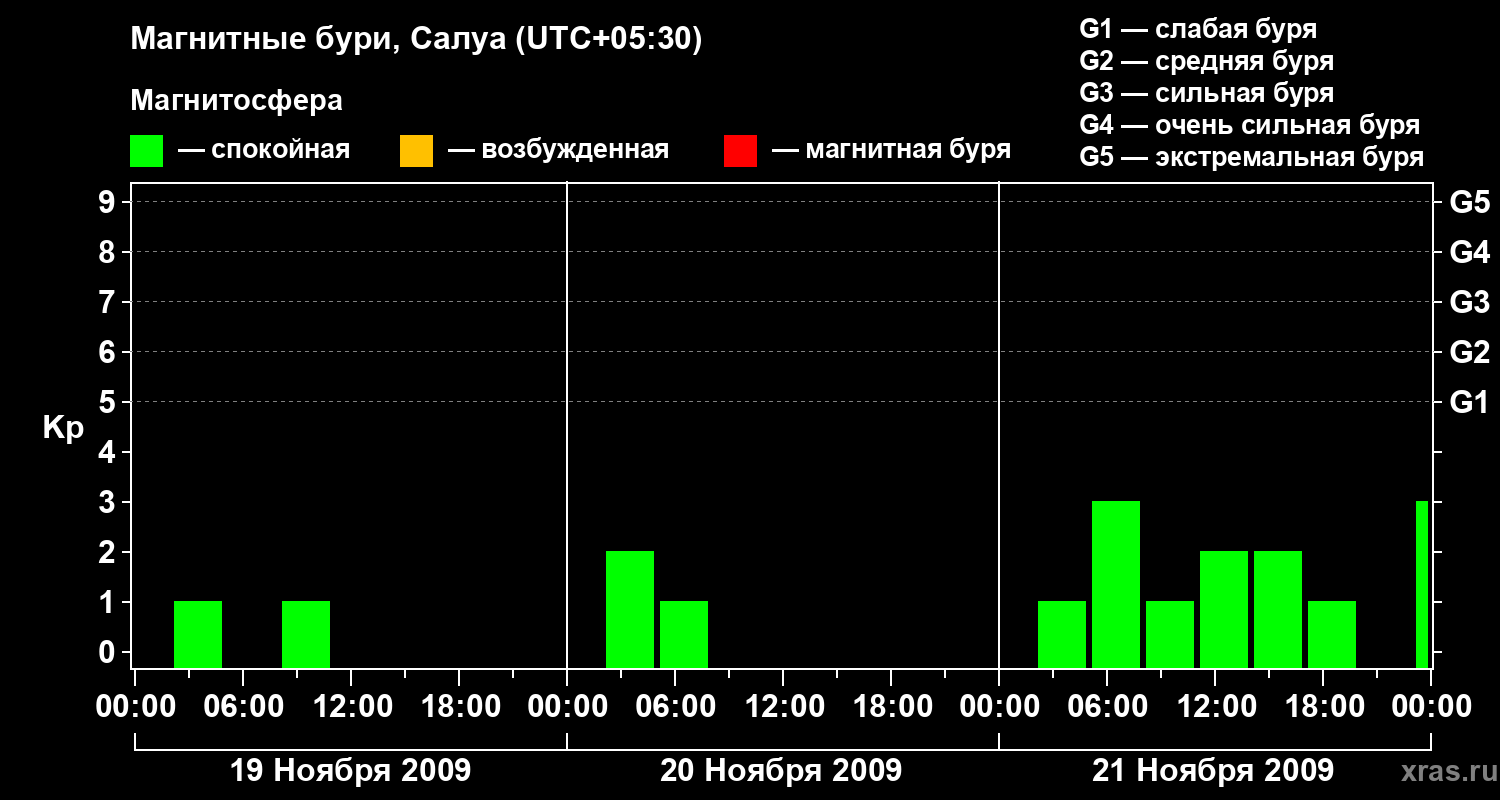 Изменения геомагнитного индекса Kp с 19 по 21 ноября 2009 года для средних широт