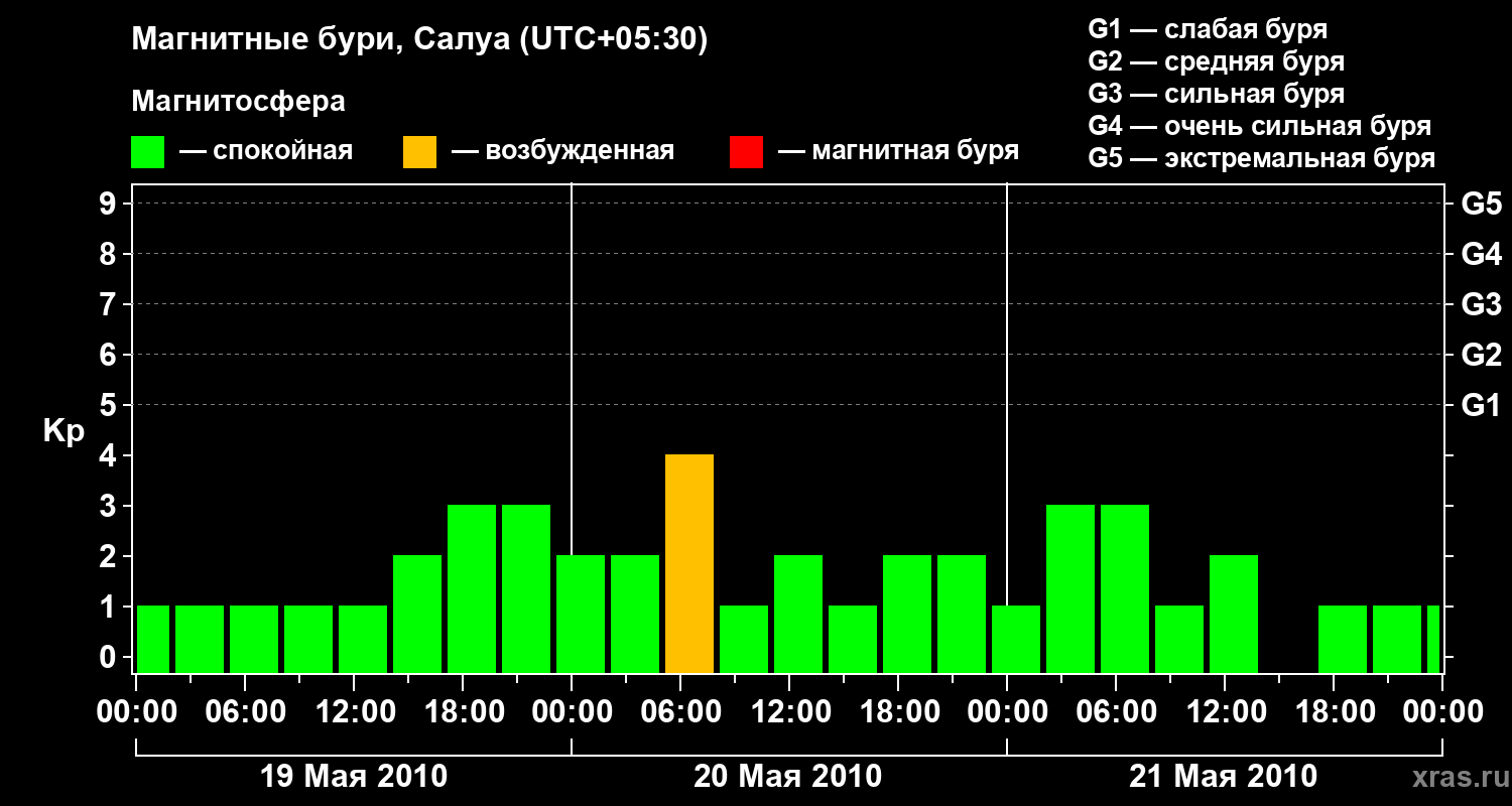 Изменения геомагнитного индекса Kp с 19 по 21 мая 2010 года для средних широт