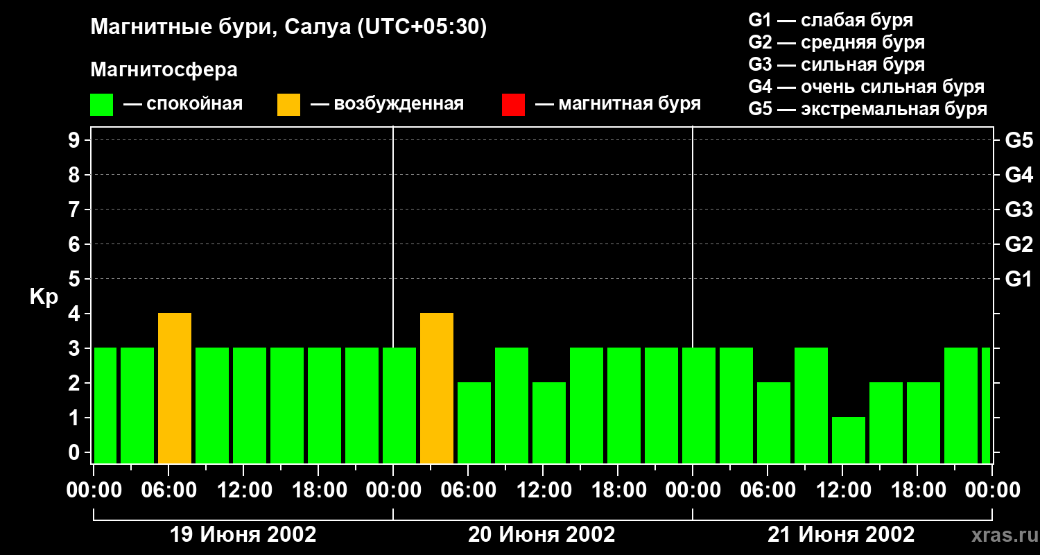 Изменения геомагнитного индекса Kp с 19 по 21 июня 2002 года для средних широт
