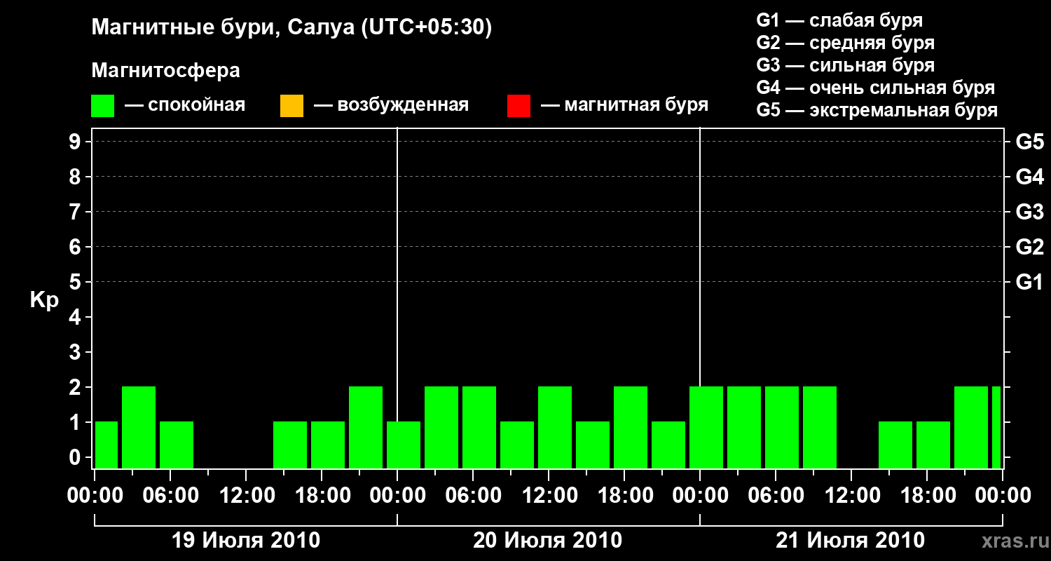 Изменения геомагнитного индекса Kp с 19 по 21 июля 2010 года для средних широт