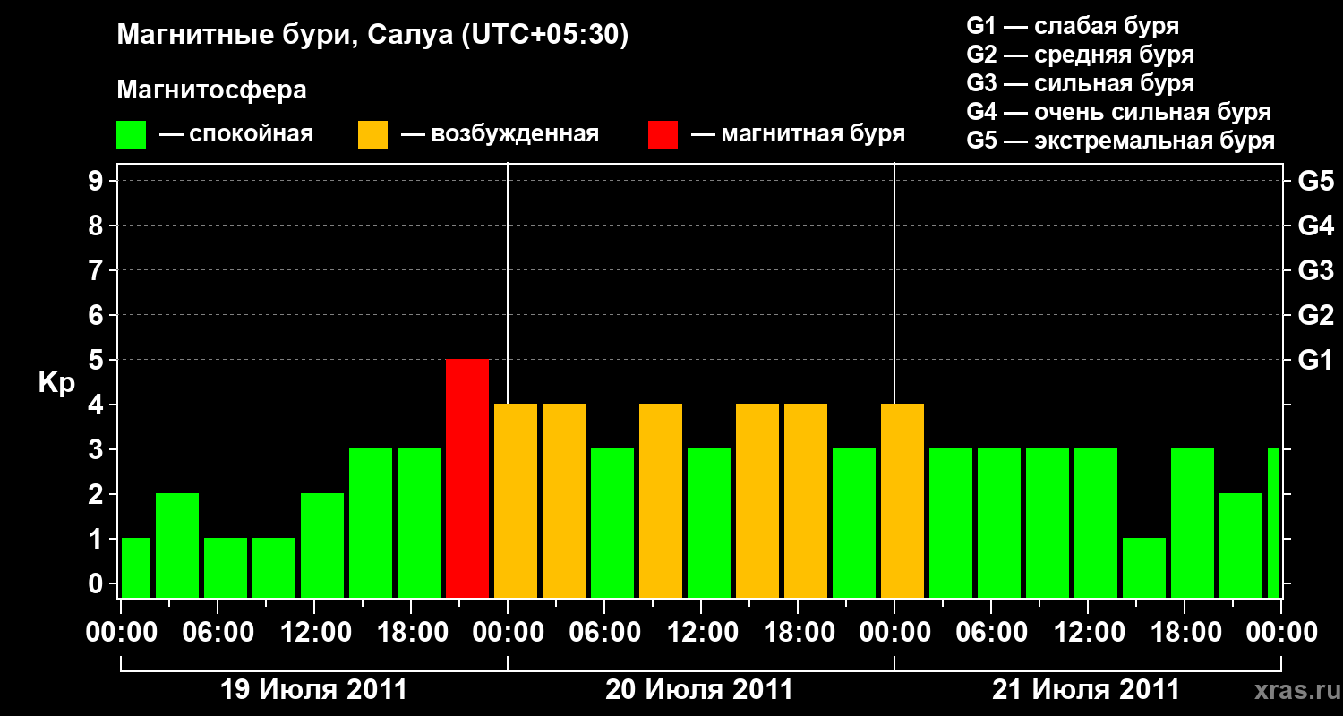 Изменения геомагнитного индекса Kp с 19 по 21 июля 2011 года для средних широт