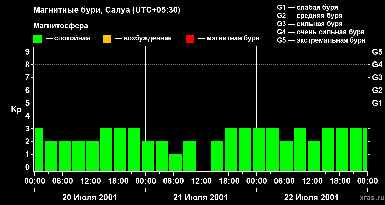 Изменения геомагнитного индекса Kp с 20 по 22 июля 2001 года для средних широт
