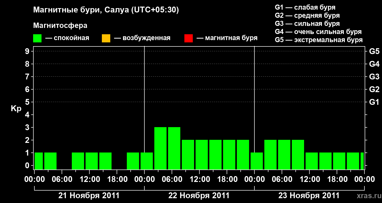 Изменения геомагнитного индекса Kp с 21 по 23 ноября 2011 года для средних широт