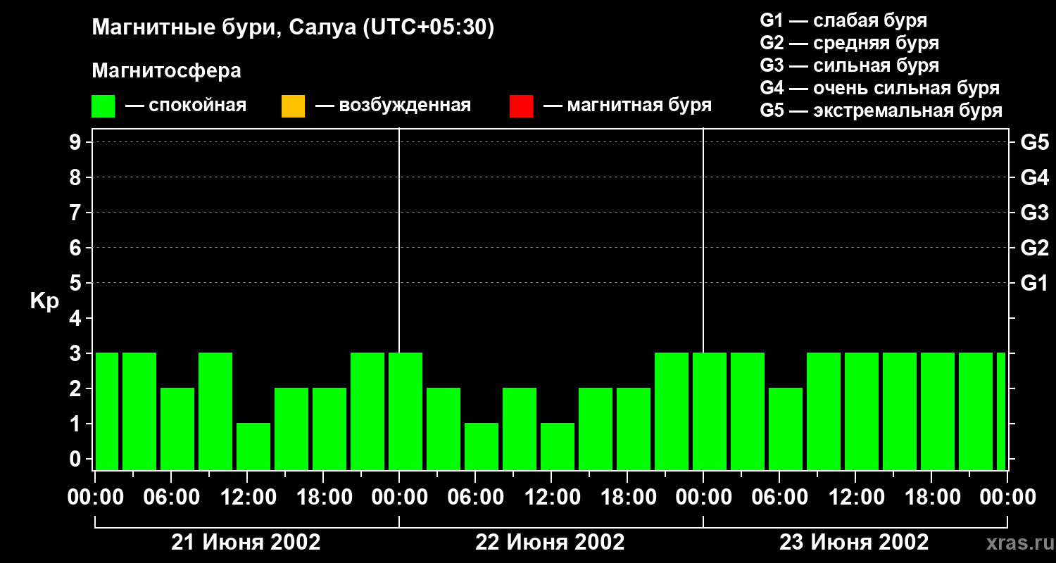 Изменения геомагнитного индекса Kp с 21 по 23 июня 2002 года для средних широт