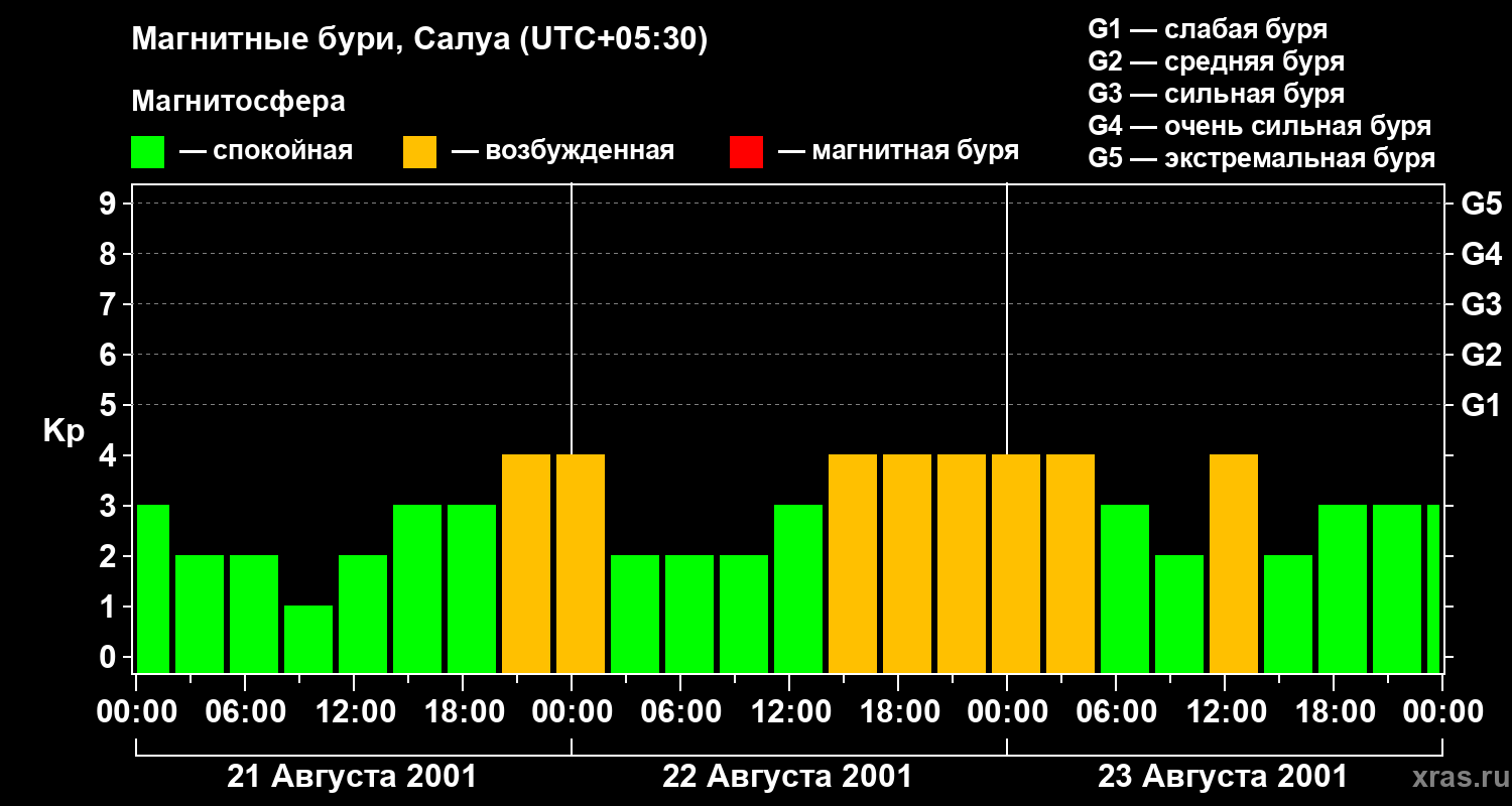 Изменения геомагнитного индекса Kp с 21 по 23 августа 2001 года для средних широт