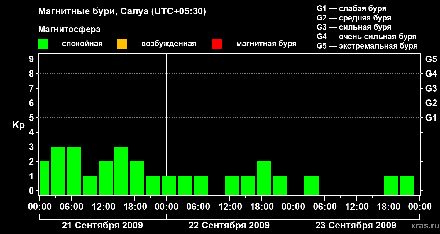 Изменения геомагнитного индекса Kp с 21 по 23 сентября 2009 года для средних широт