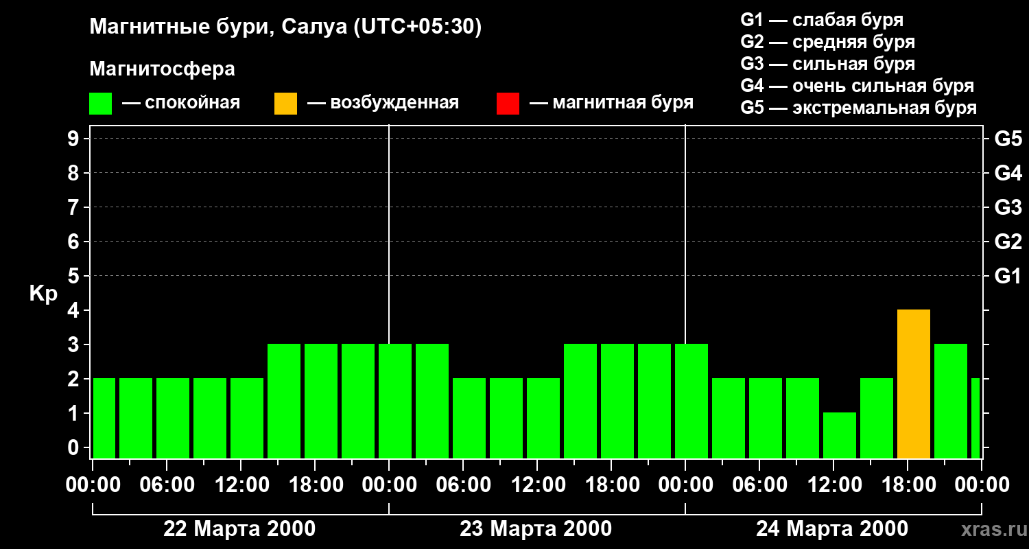 Изменения геомагнитного индекса Kp с 22 по 24 марта 2000 года для средних широт