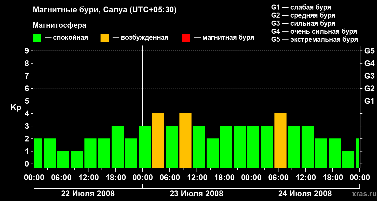 Изменения геомагнитного индекса Kp с 22 по 24 июля 2008 года для средних широт