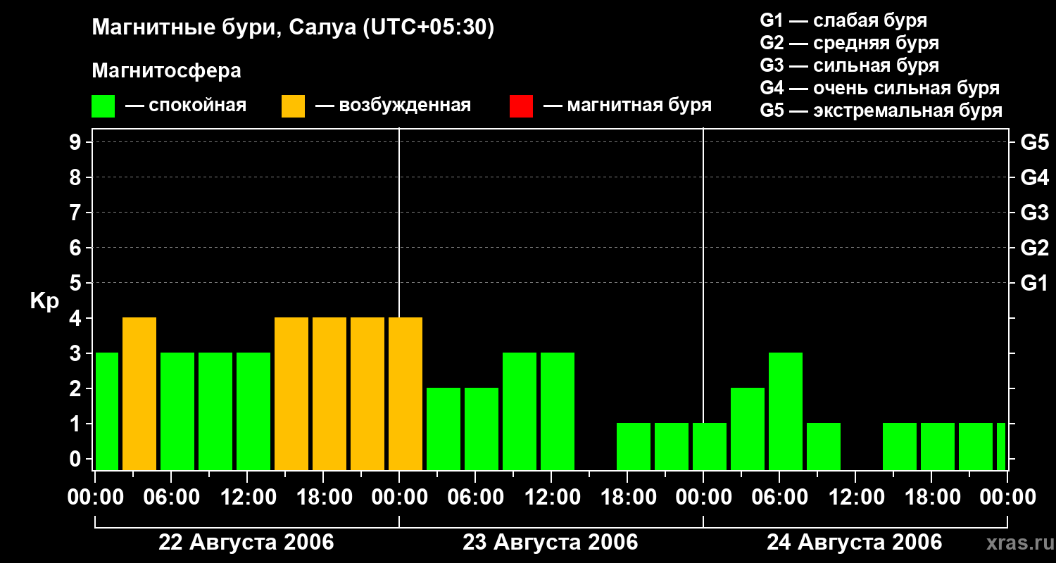 Изменения геомагнитного индекса Kp с 22 по 24 августа 2006 года для средних широт
