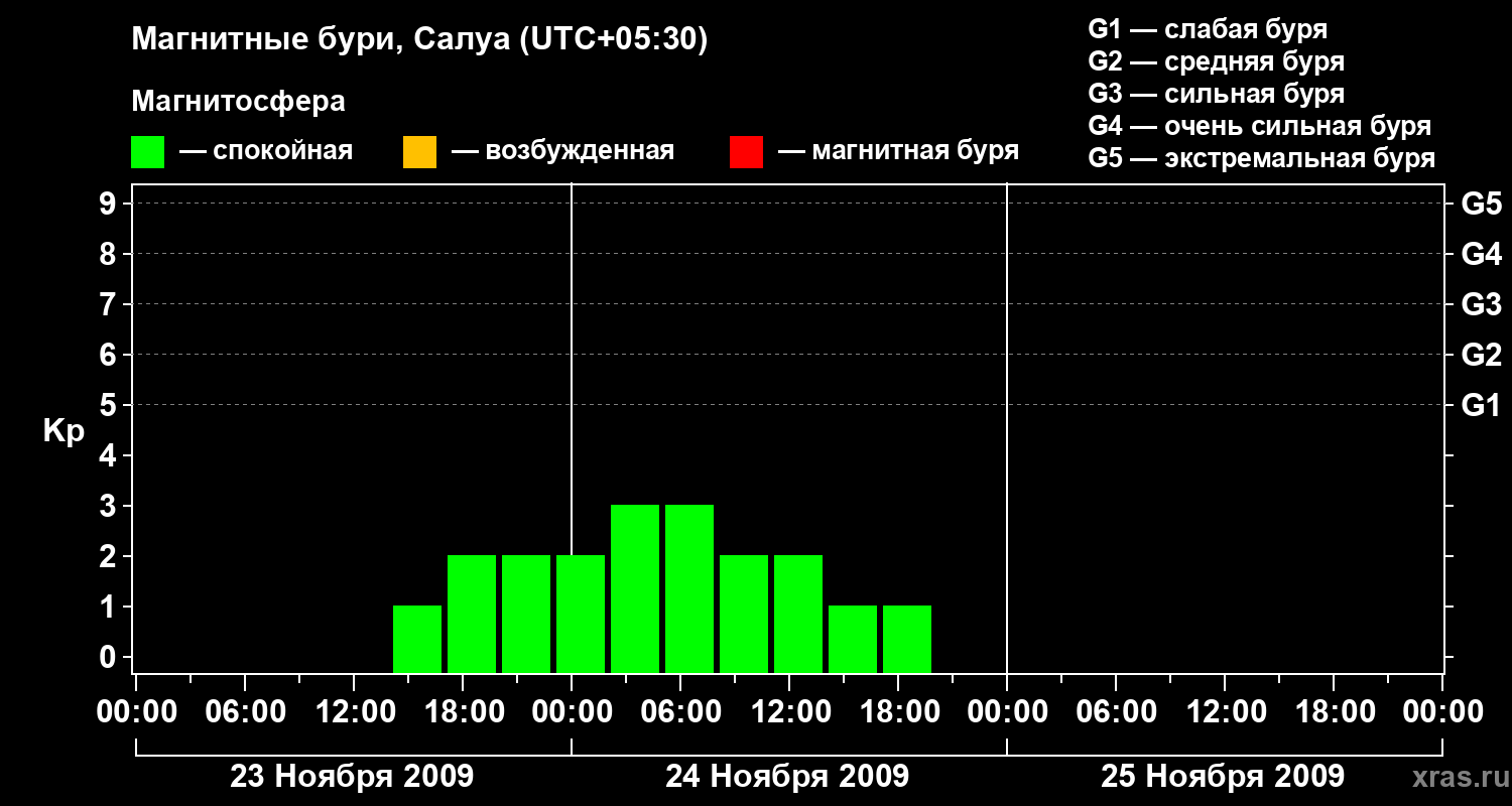 Изменения геомагнитного индекса Kp с 23 по 25 ноября 2009 года для средних широт