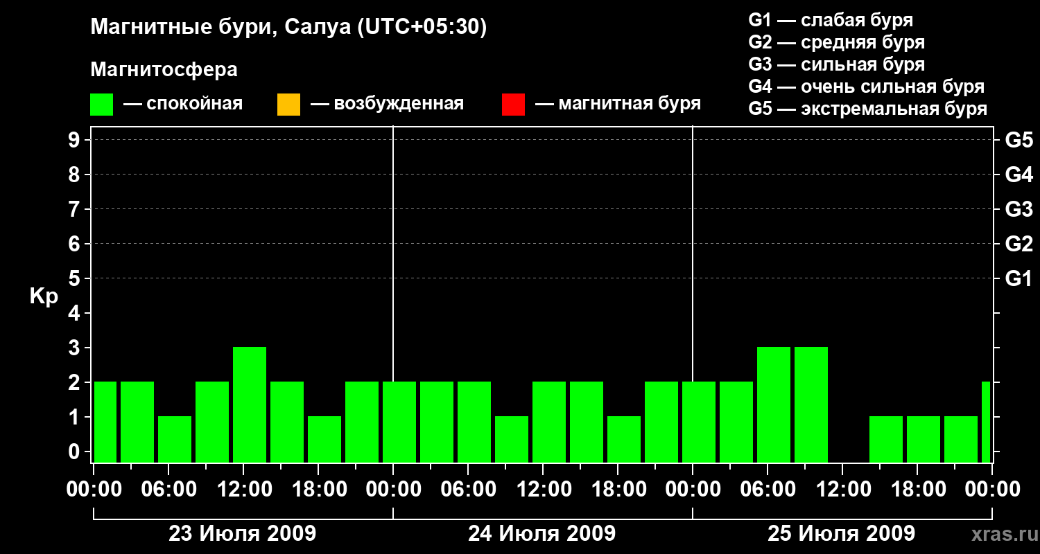 Изменения геомагнитного индекса Kp с 23 по 25 июля 2009 года для средних широт