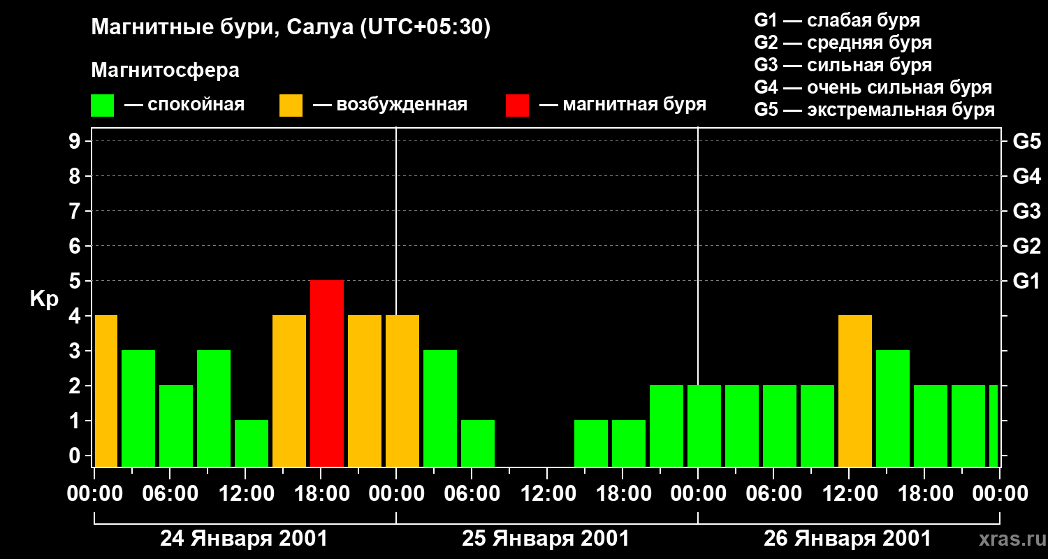 Изменения геомагнитного индекса Kp с 24 по 26 января 2001 года для средних широт