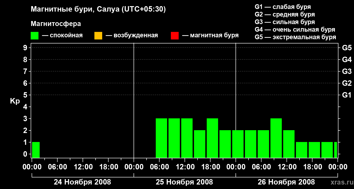 Изменения геомагнитного индекса Kp с 24 по 26 ноября 2008 года для средних широт