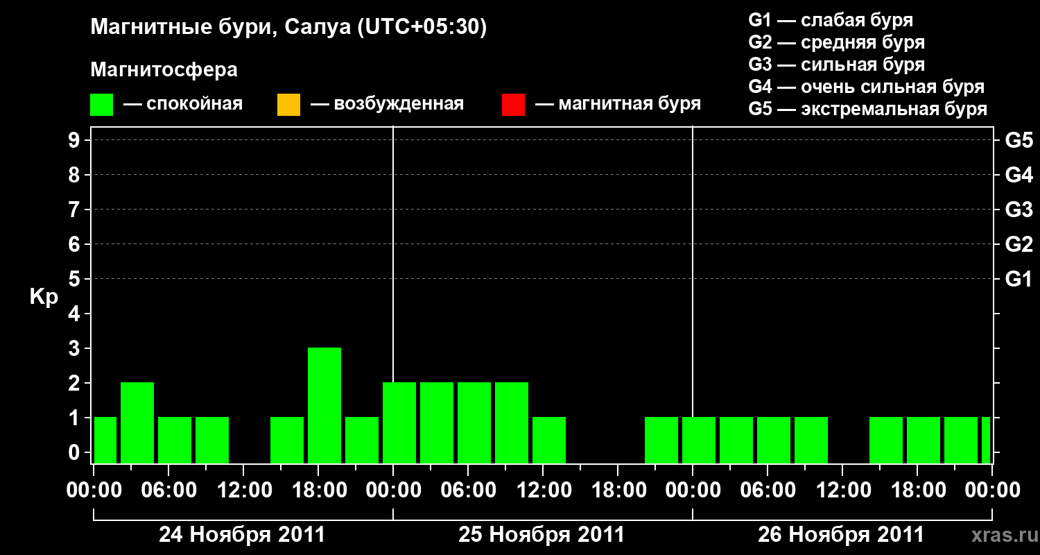 Изменения геомагнитного индекса Kp с 24 по 26 ноября 2011 года для средних широт
