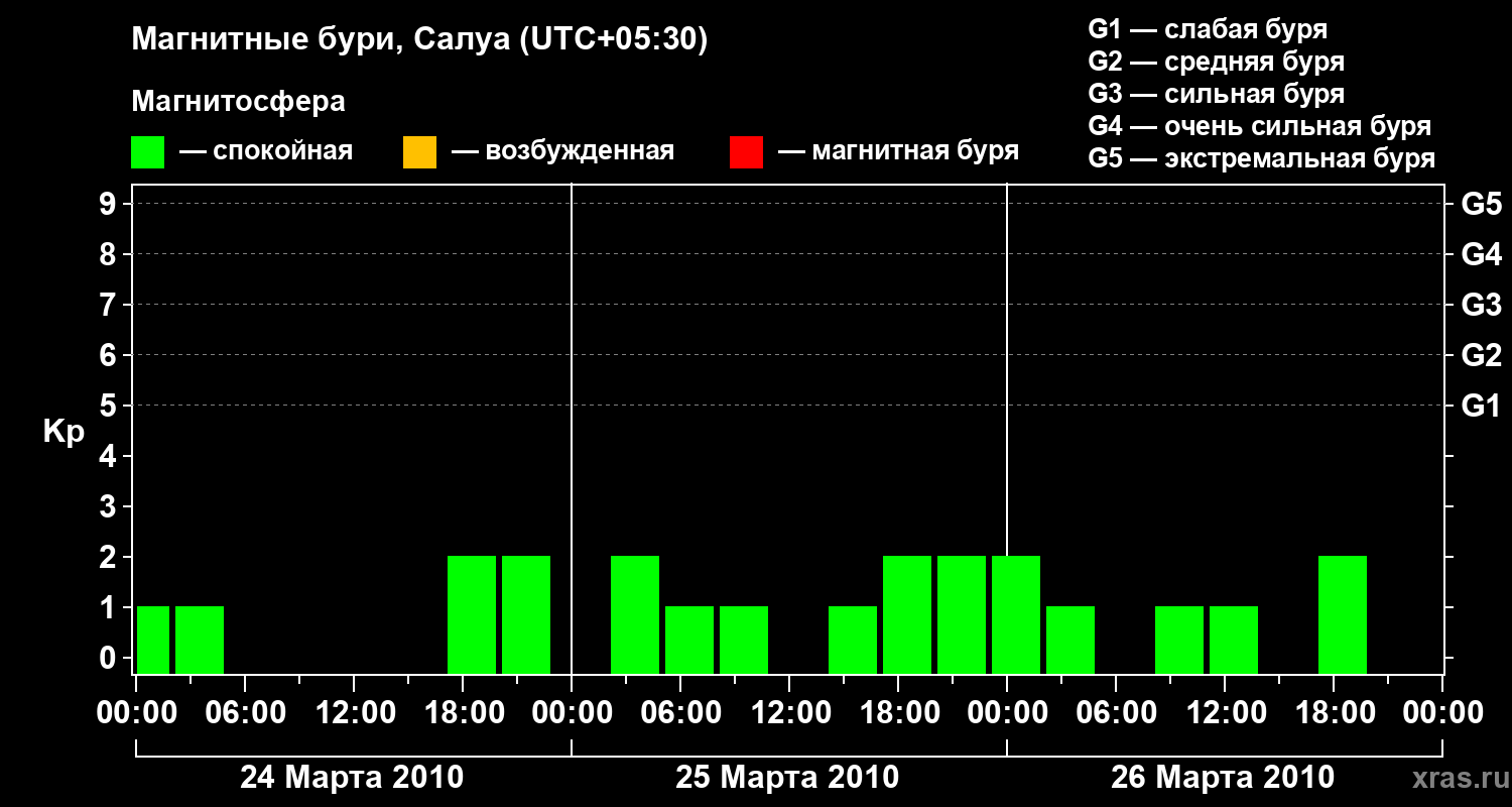 Изменения геомагнитного индекса Kp с 24 по 26 марта 2010 года для средних широт