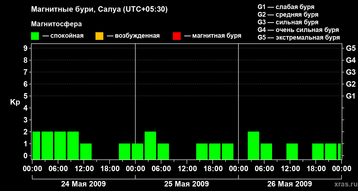 Изменения геомагнитного индекса Kp с 24 по 26 мая 2009 года для средних широт