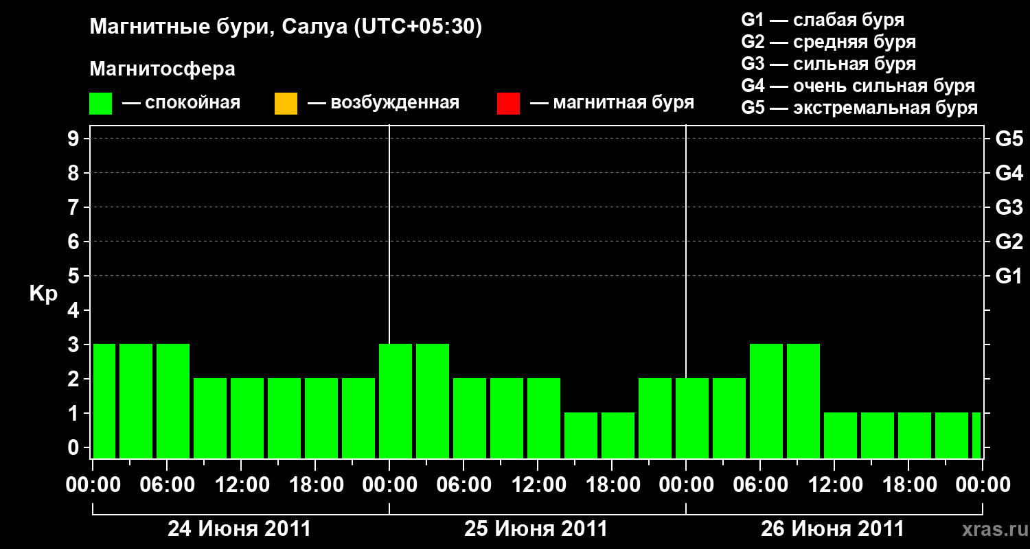Изменения геомагнитного индекса Kp с 24 по 26 июня 2011 года для средних широт