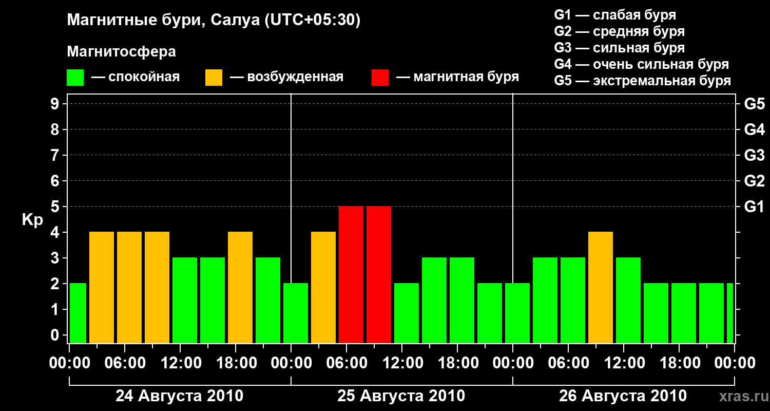 Изменения геомагнитного индекса Kp с 24 по 26 августа 2010 года для средних широт