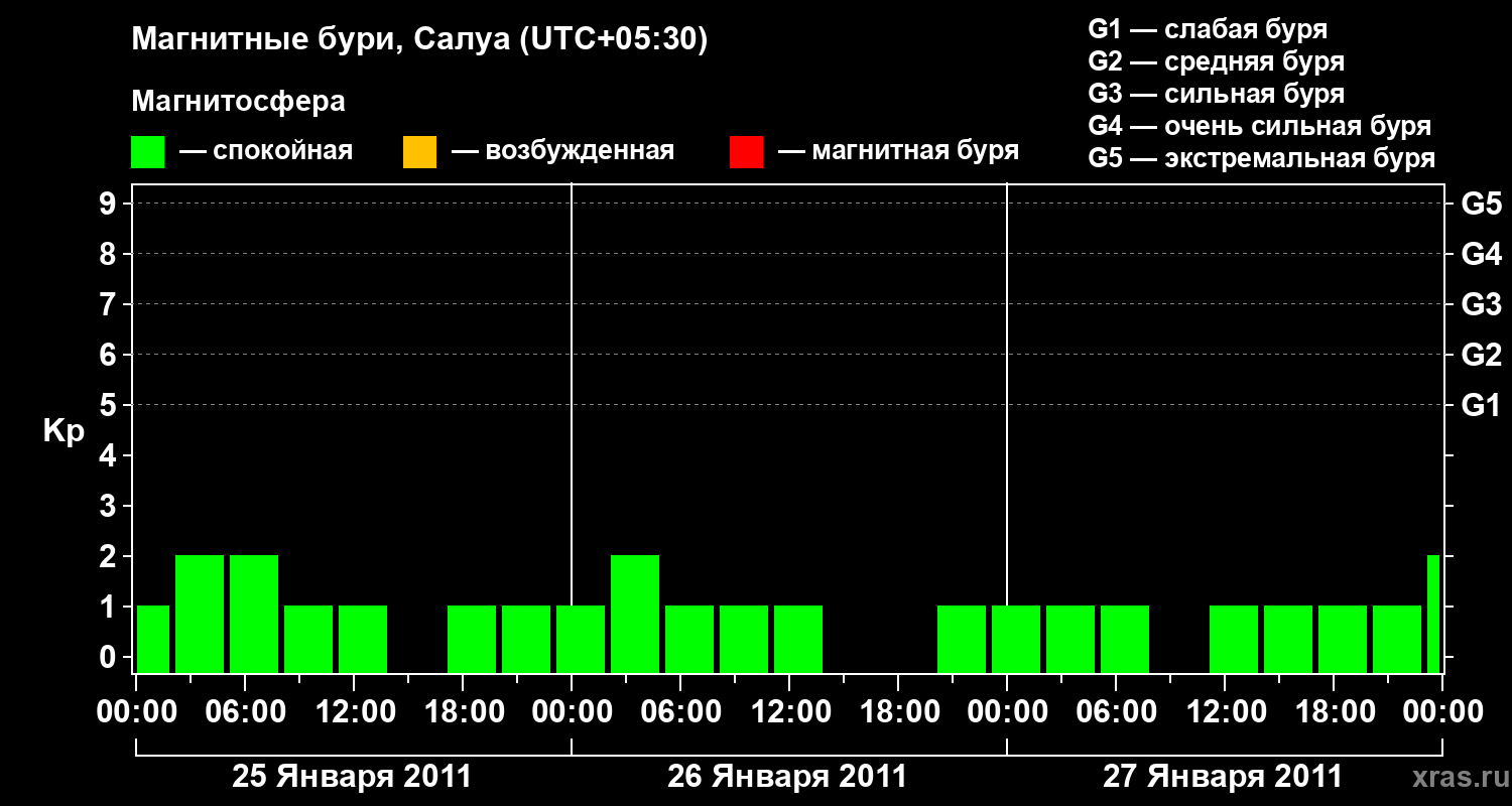 Изменения геомагнитного индекса Kp с 25 по 27 января 2011 года для средних широт