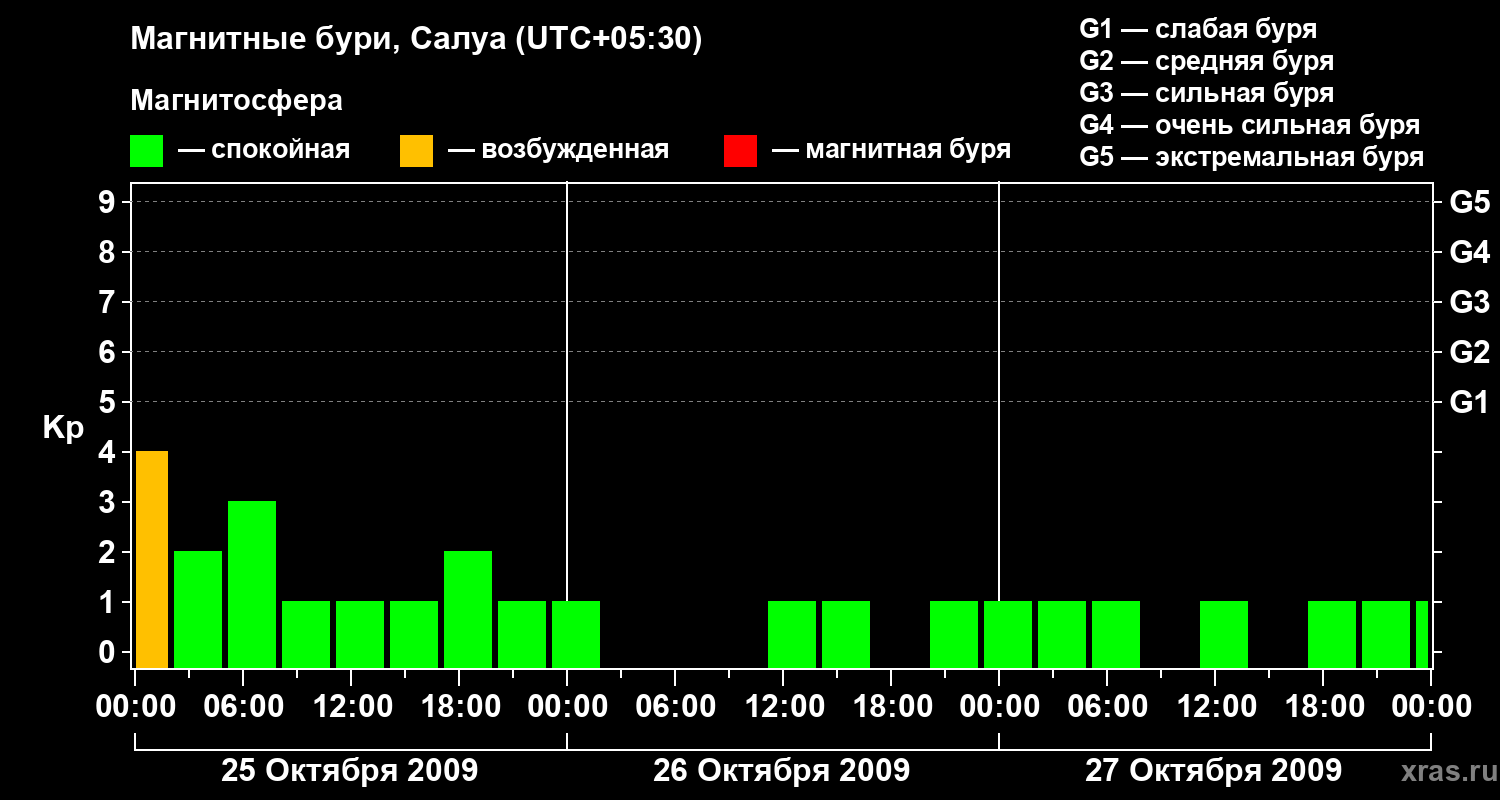 Изменения геомагнитного индекса Kp с 25 по 27 октября 2009 года для средних широт