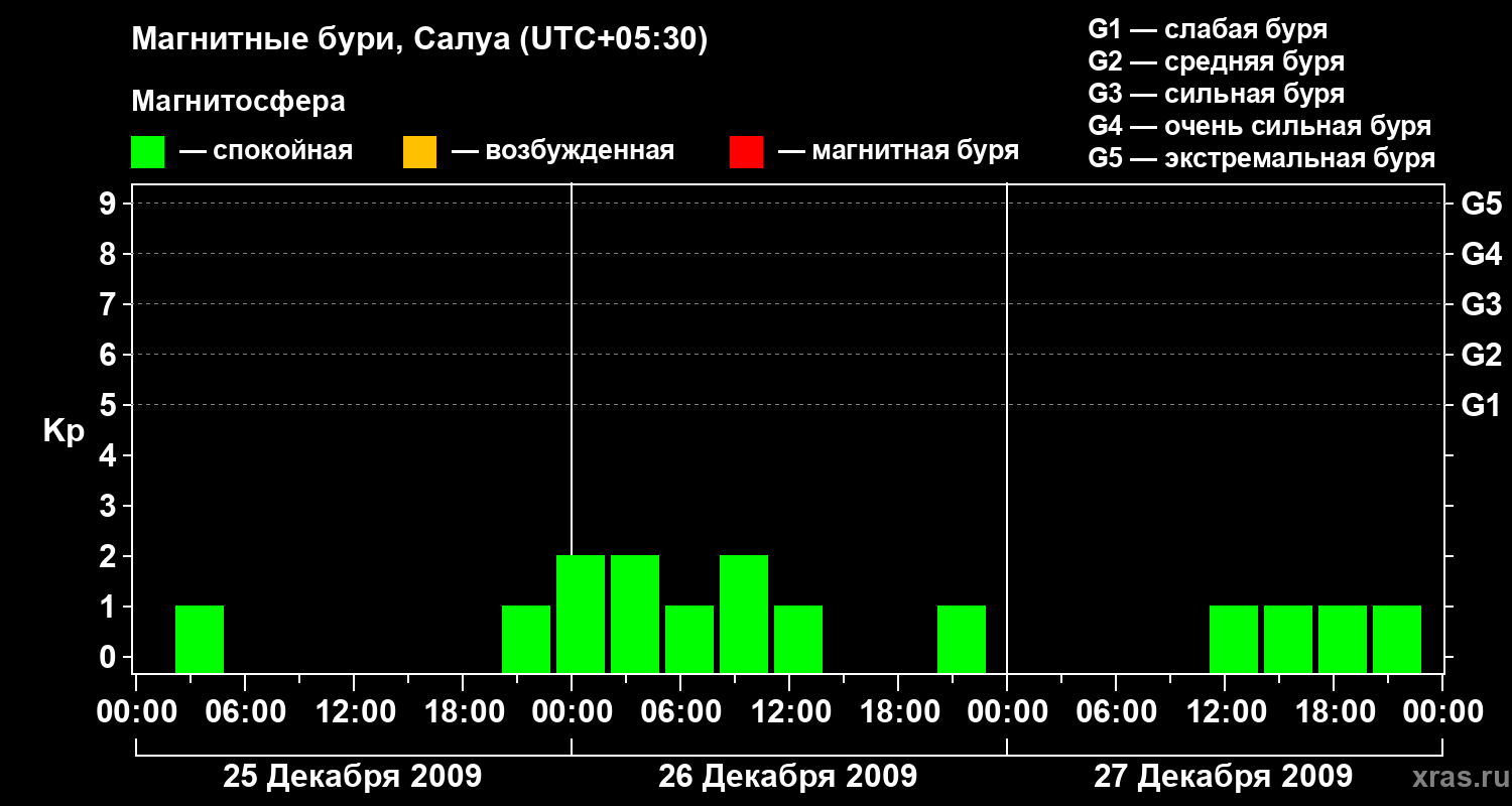 Изменения геомагнитного индекса Kp с 25 по 27 декабря 2009 года для средних широт