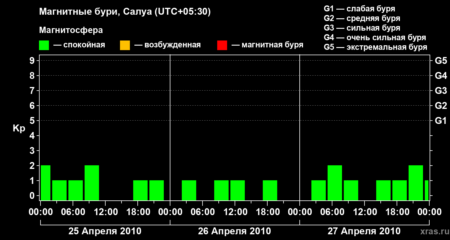 Изменения геомагнитного индекса Kp с 25 по 27 апреля 2010 года для средних широт