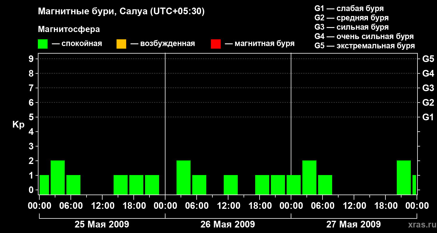 Изменения геомагнитного индекса Kp с 25 по 27 мая 2009 года для средних широт